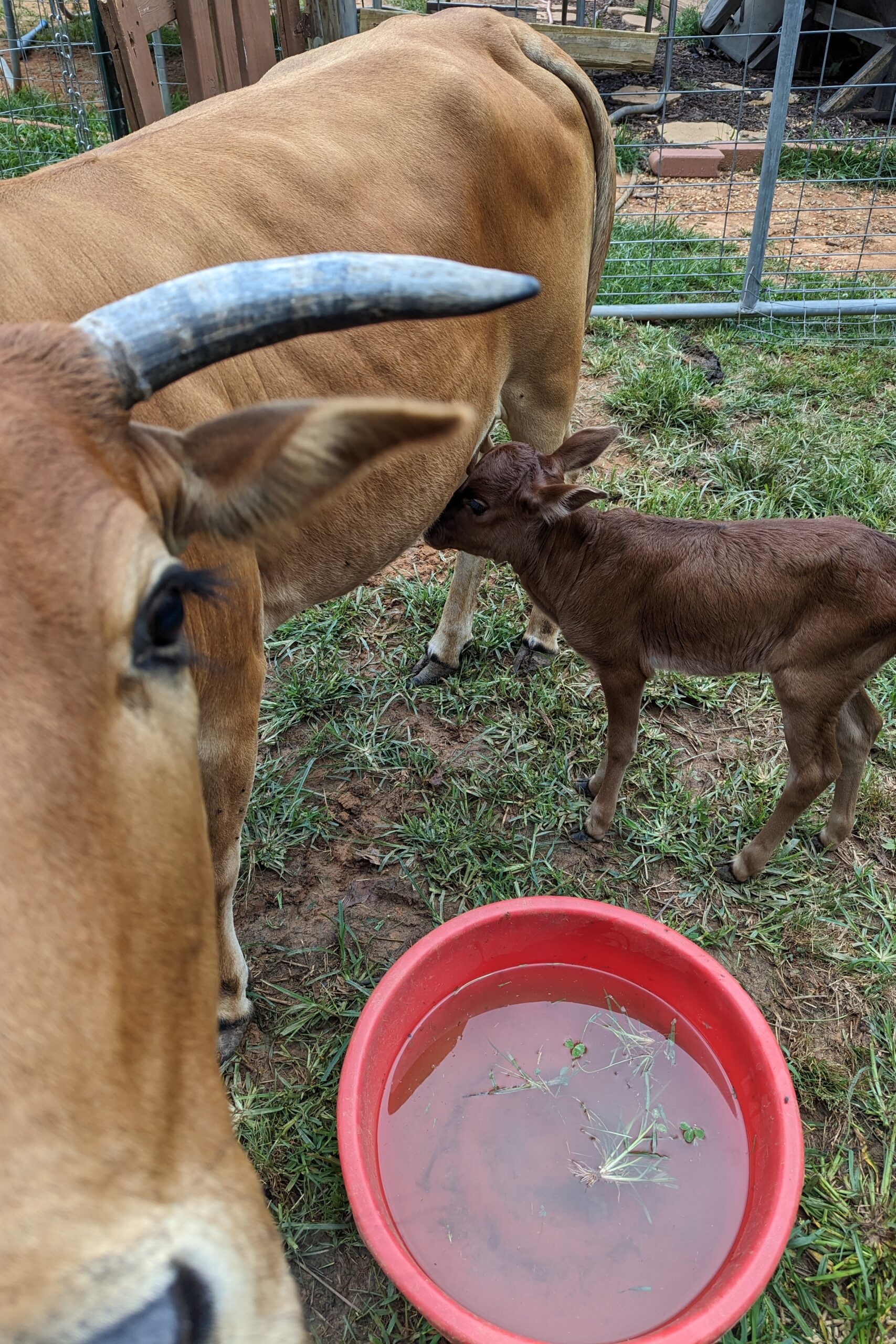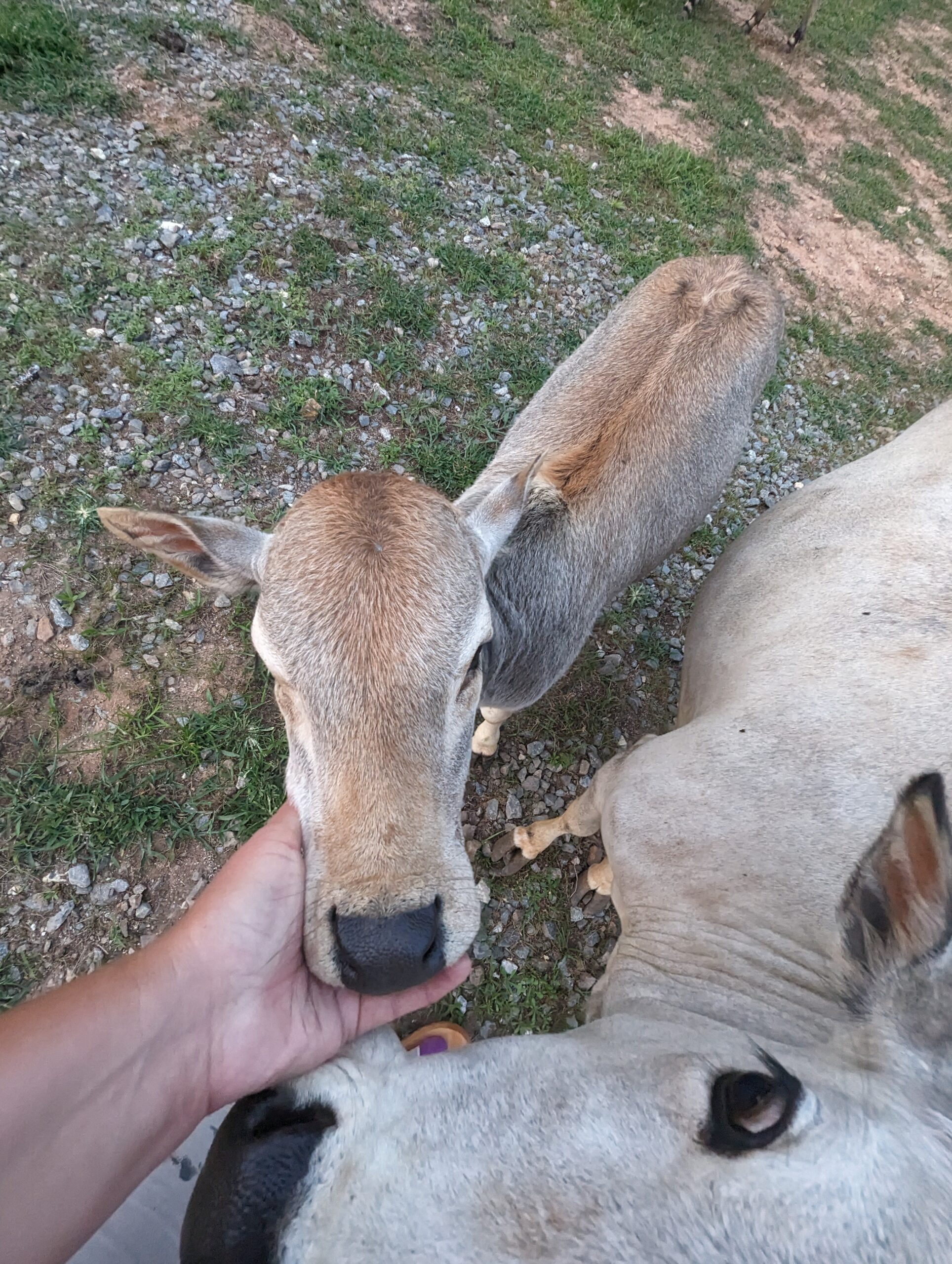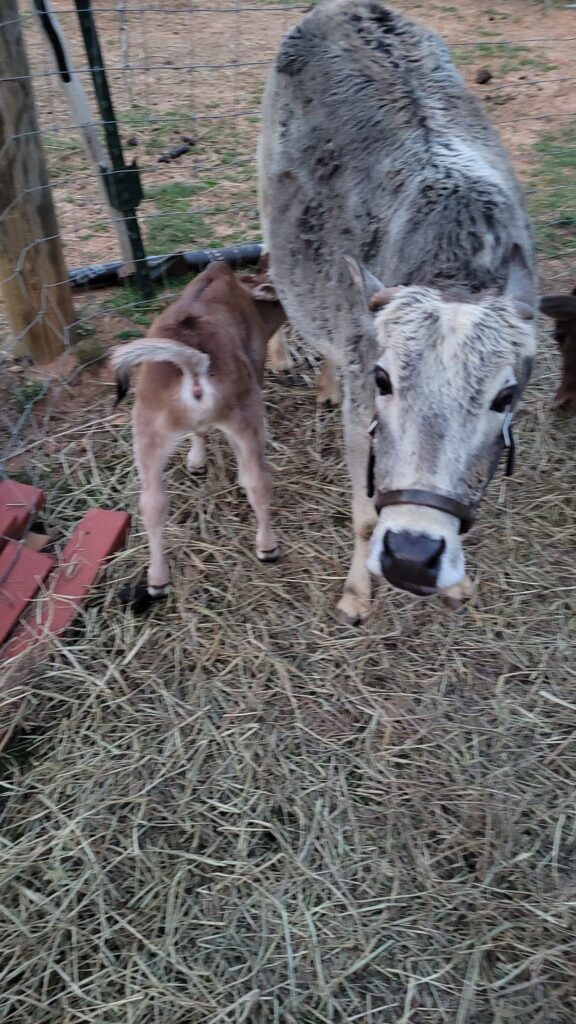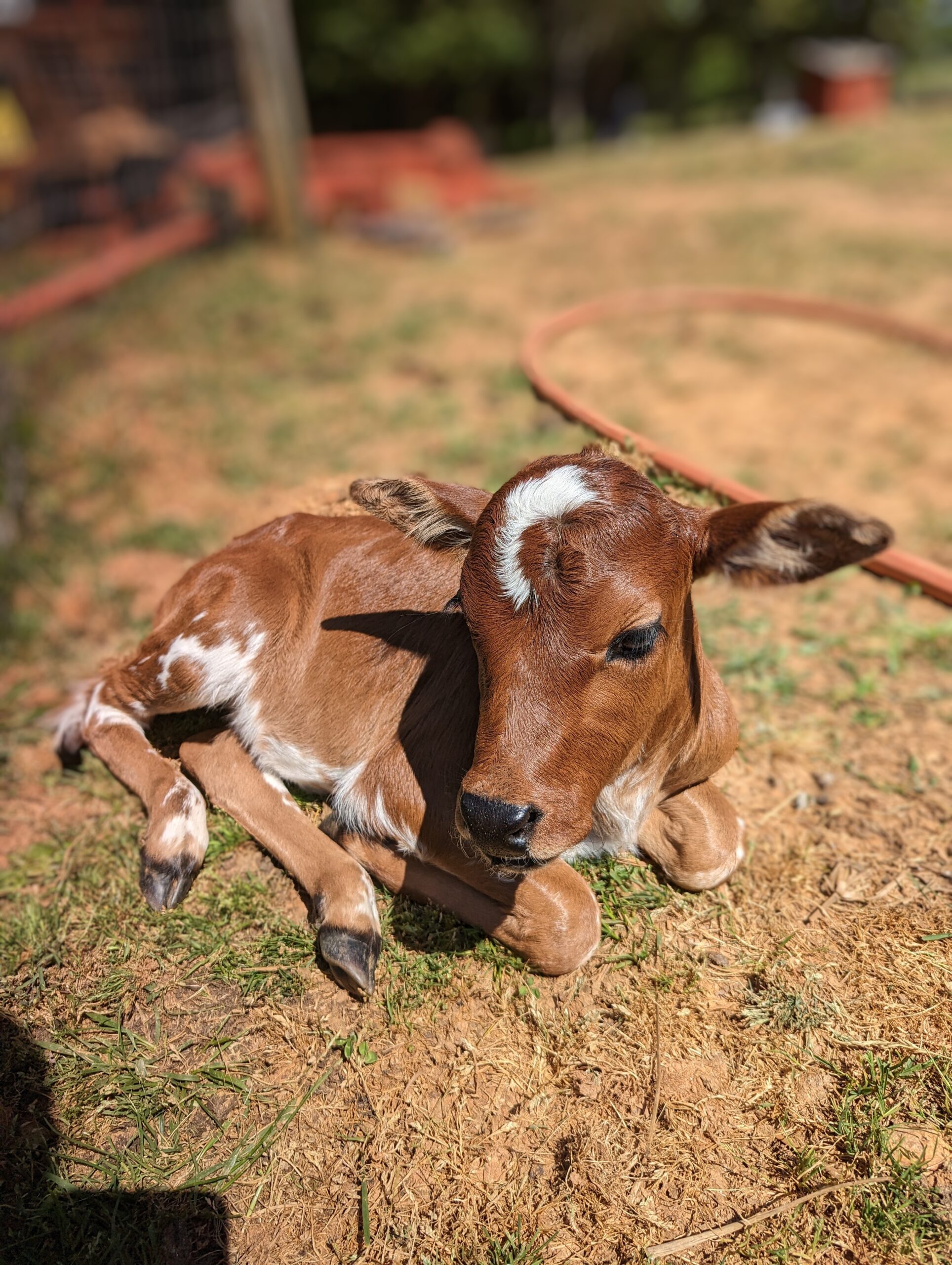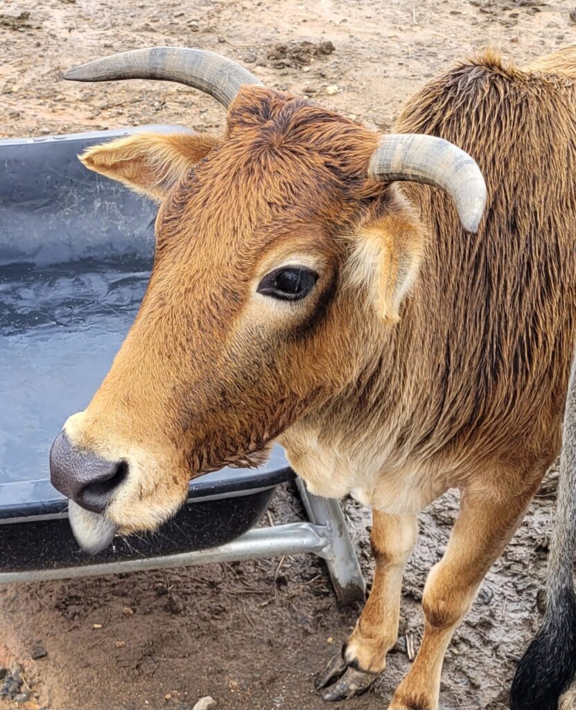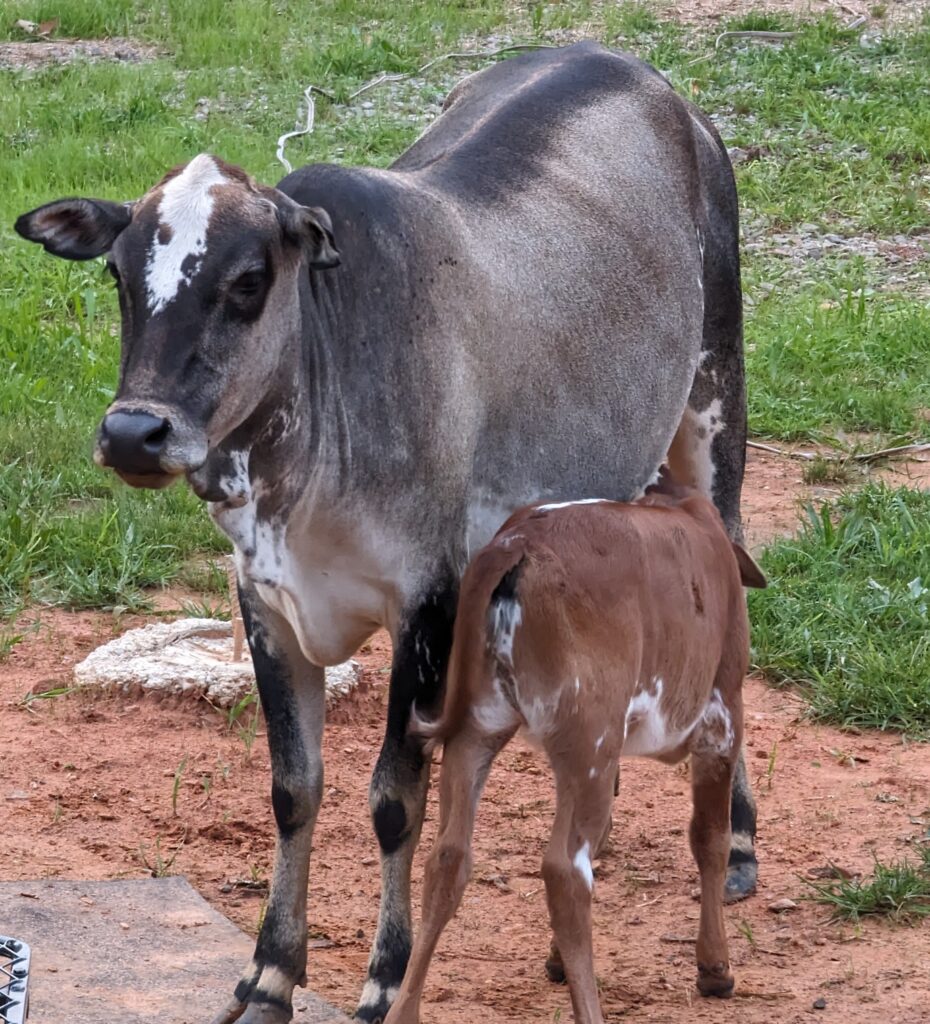 This is Jade. She came to us with a calf named Jummah by her side. She’s proven to be a good momma here on the farm. She calved Jasmine in 2023.