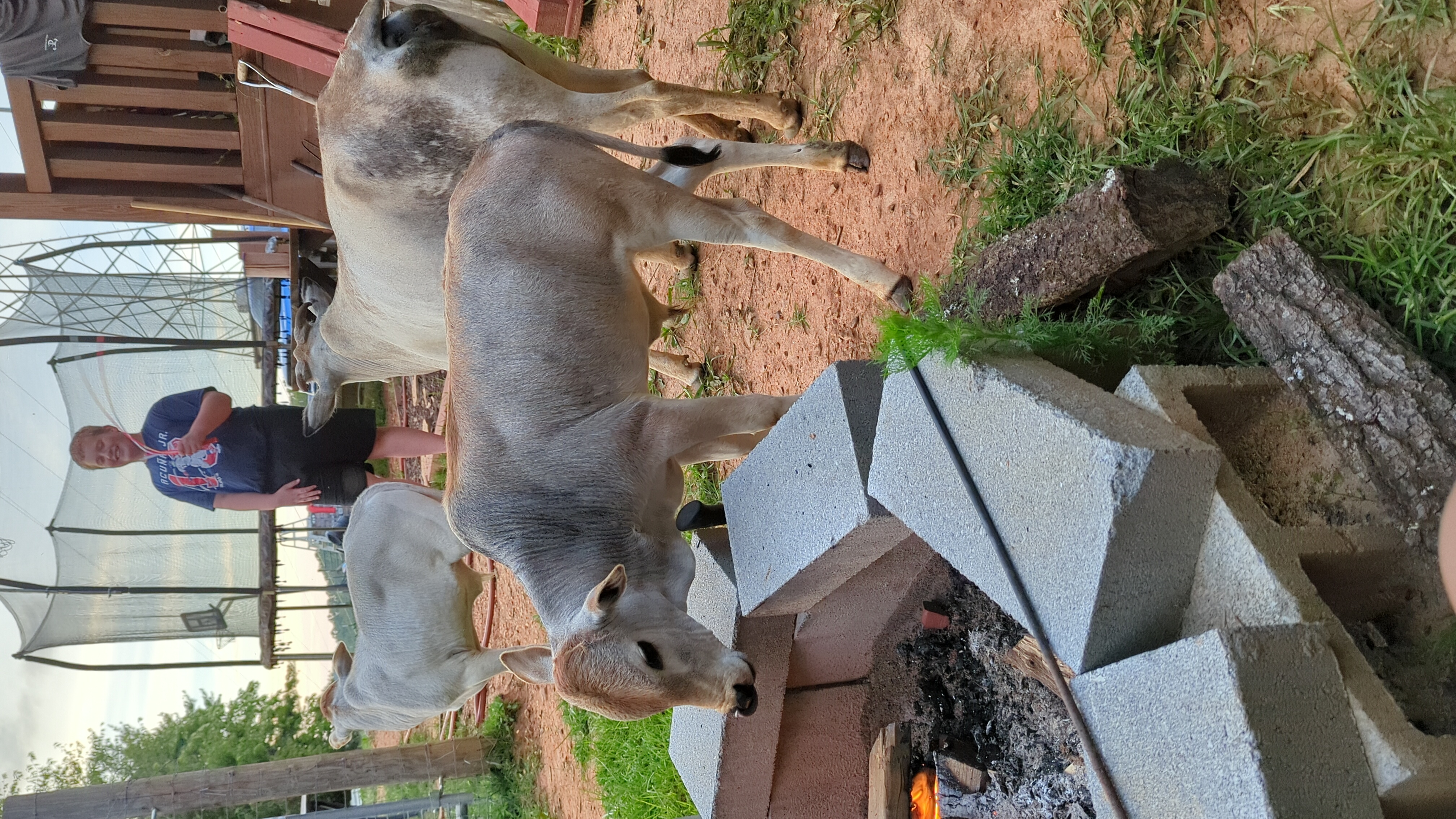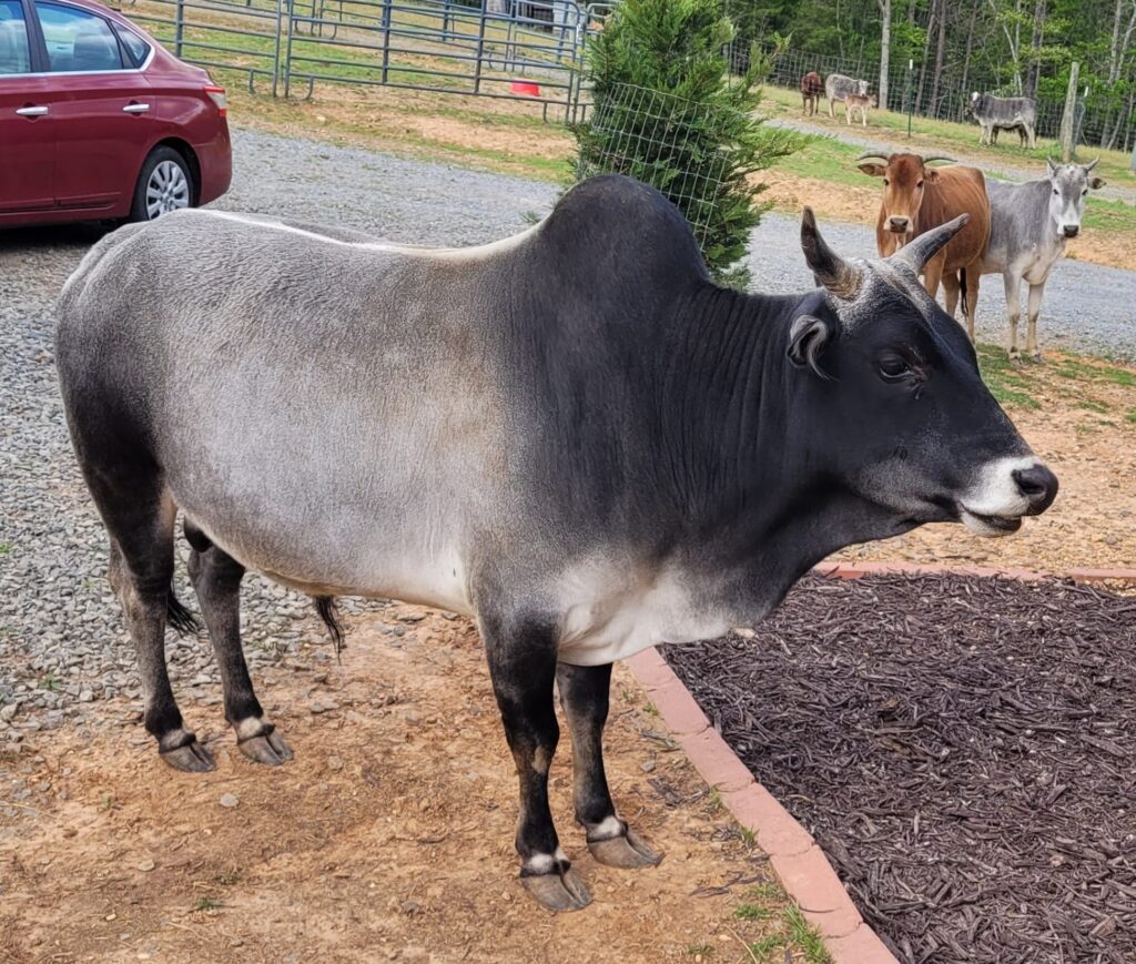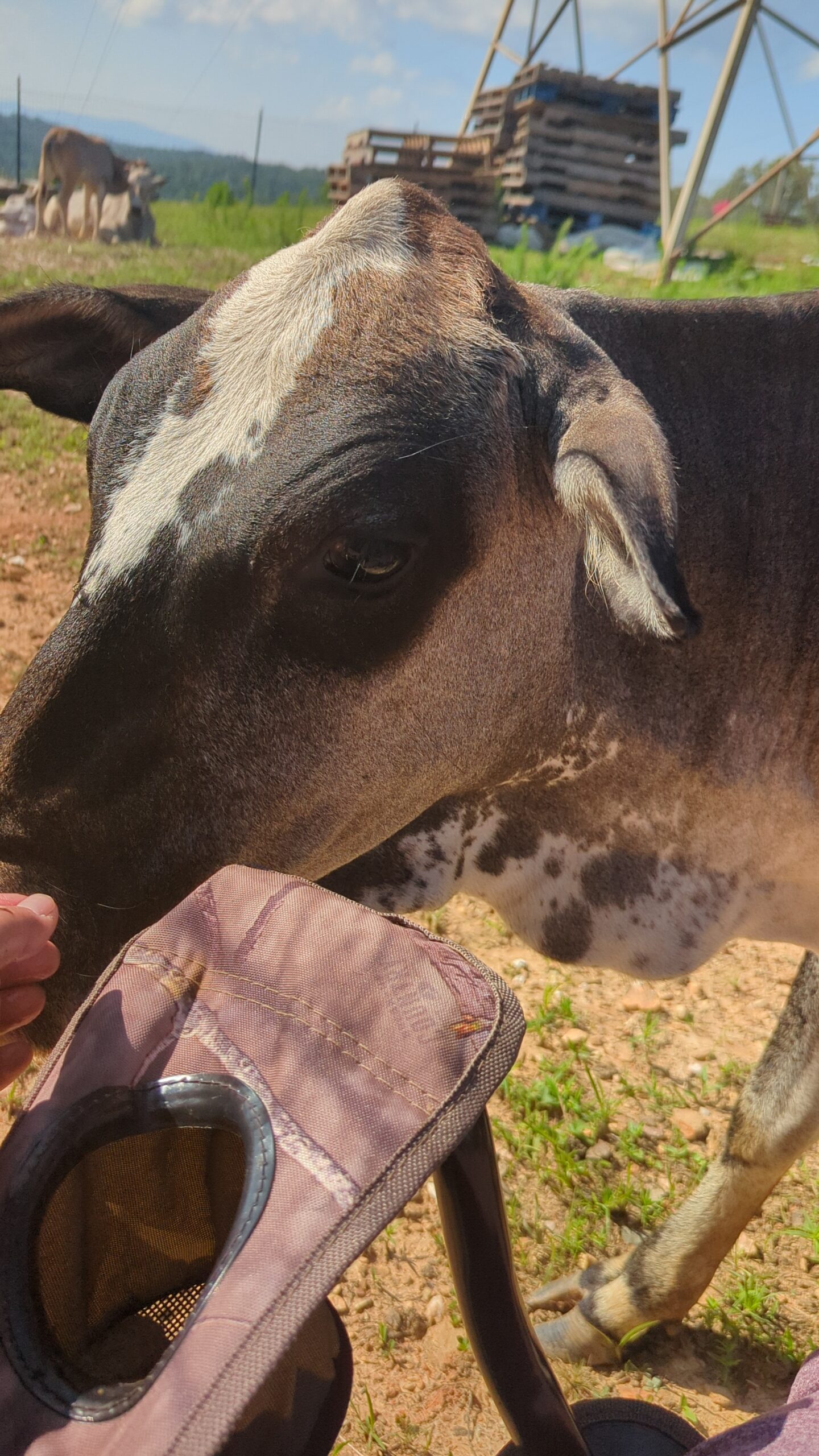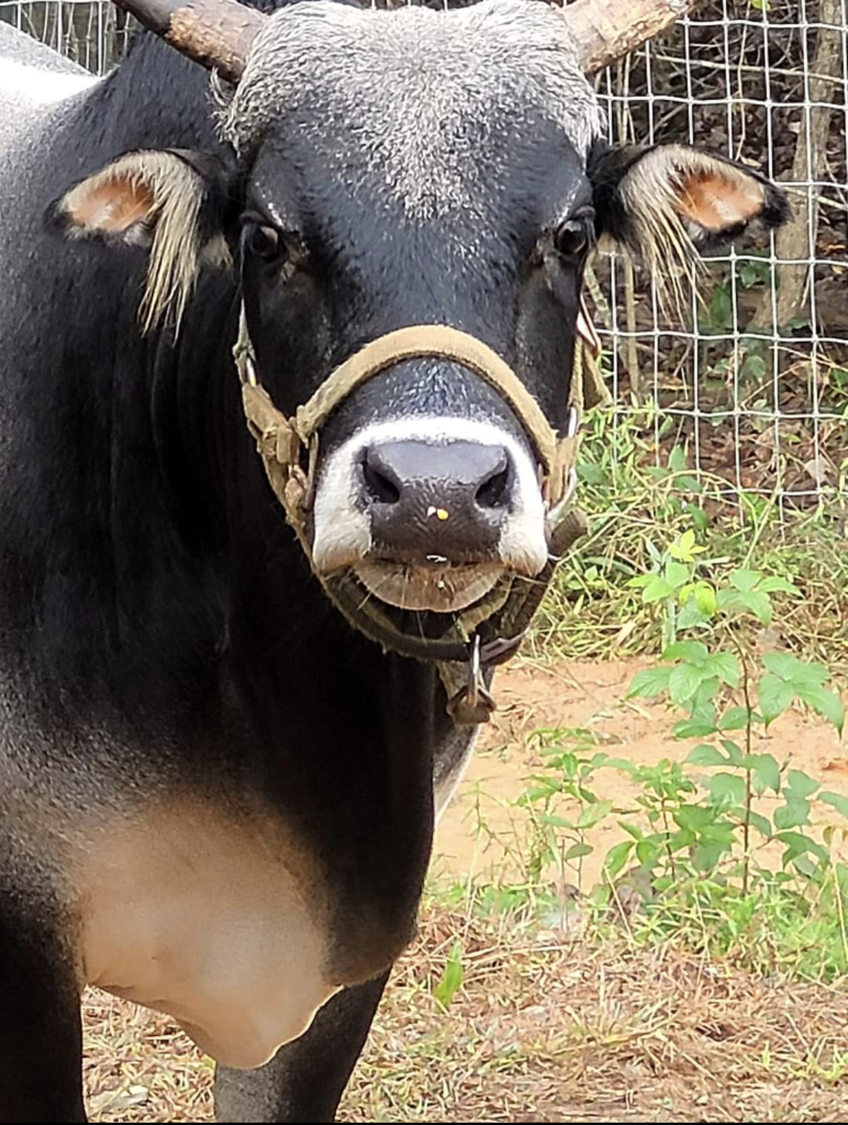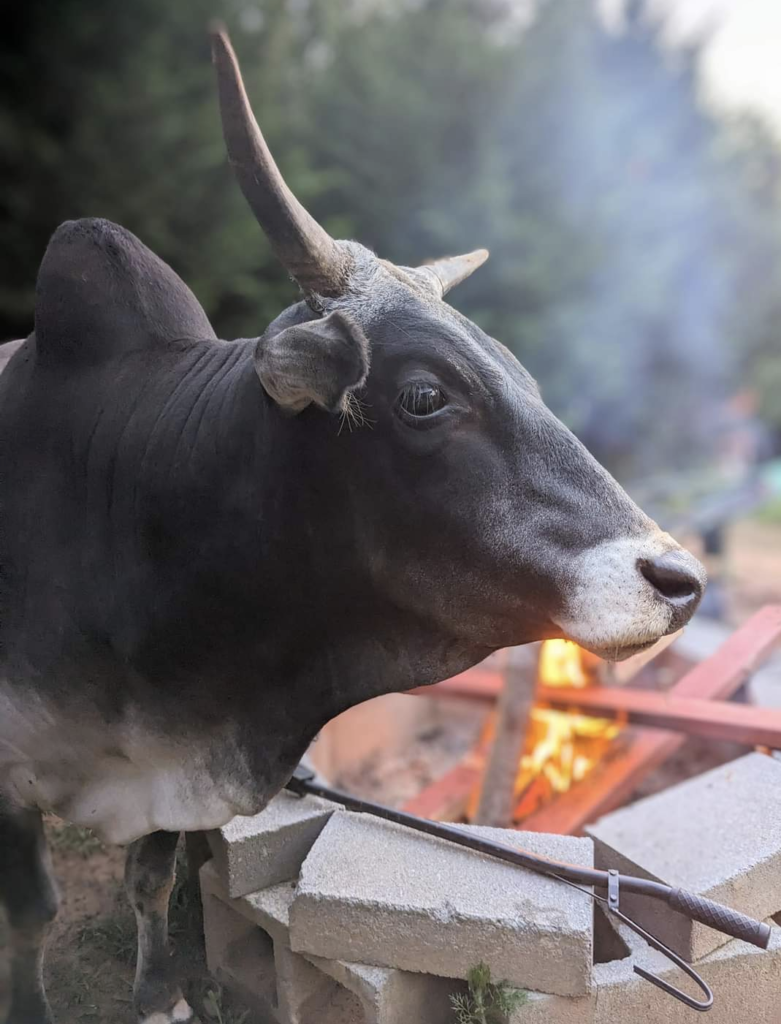 El Toro is our other herd sire. He was one of our first zebu on the farm. He has a very good disposition and is usually found following one of us around the farm. He enjoys standing around the bonfire with us.