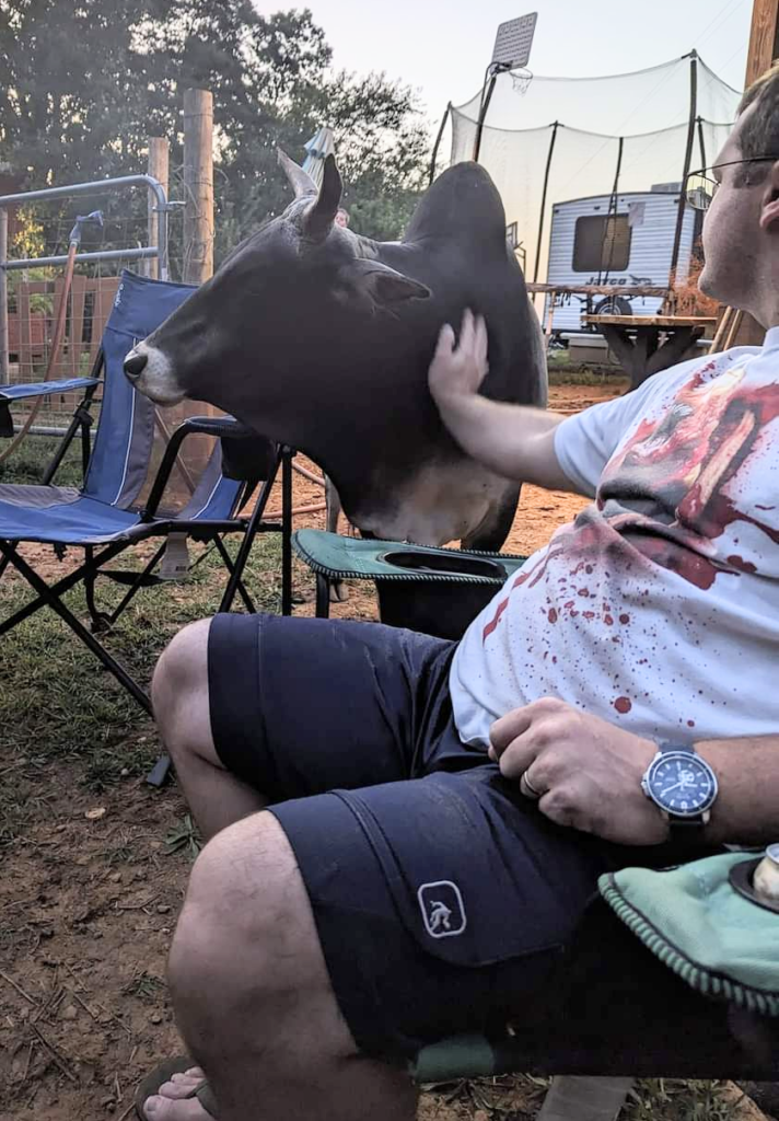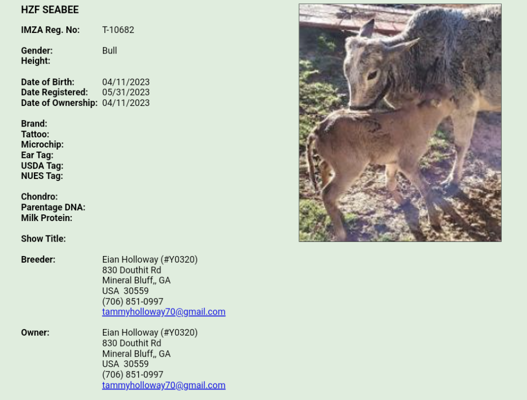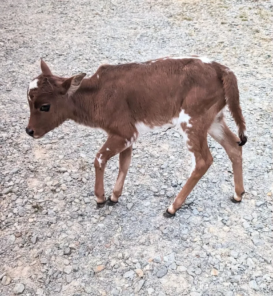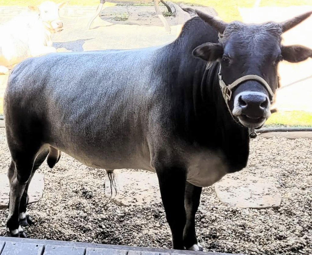 HZF Seabee was the first calf born on the property. He is turning out to be quite the character. Super friendly, loves neck scratches and treat time! He is seen playing with the farm dogs and also loves a good bonfire like his daddy. He is training for Mascot duties for a veteran’s group we belong to. Sire was El Toro; Dam was Lilly.