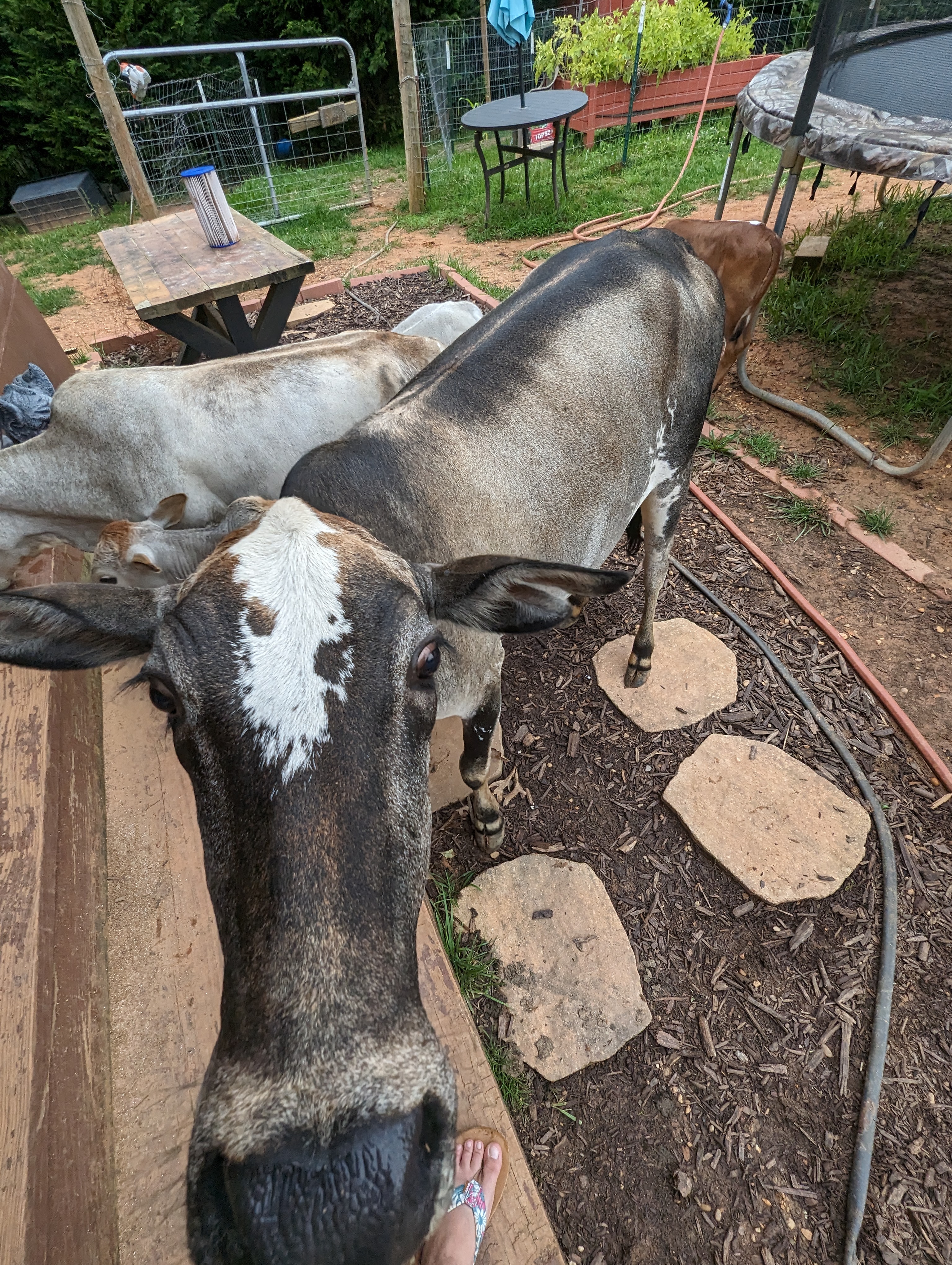 This is a La Vaca. She calved Fire and came to our farm with her. She’s come a long way and is now as sweet as the rest. We don’t allow bullying on our farm so they all get a bit of training.