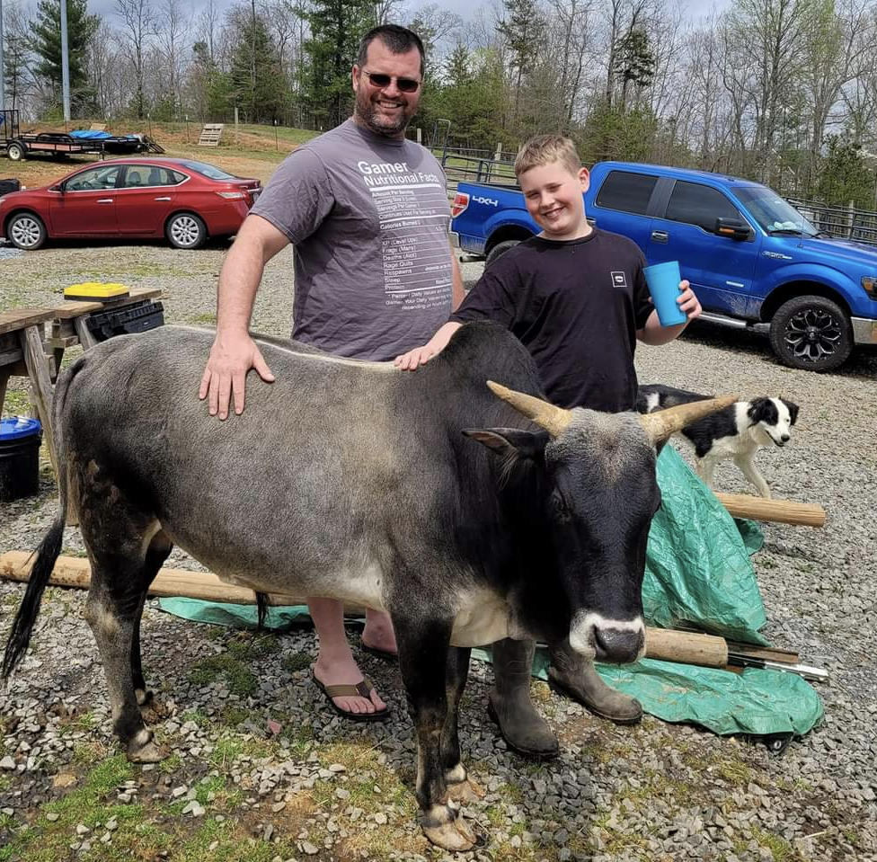 This is our Lilly. Seabee is at her side. She is a sweetie pie. When people come visit, this is who we bring out. She is friendly with a great personality. She is our smallest cow at 28″ tall. She may be small, but her moo can be heard throughout the land! She makes sure we never forget feeding time.